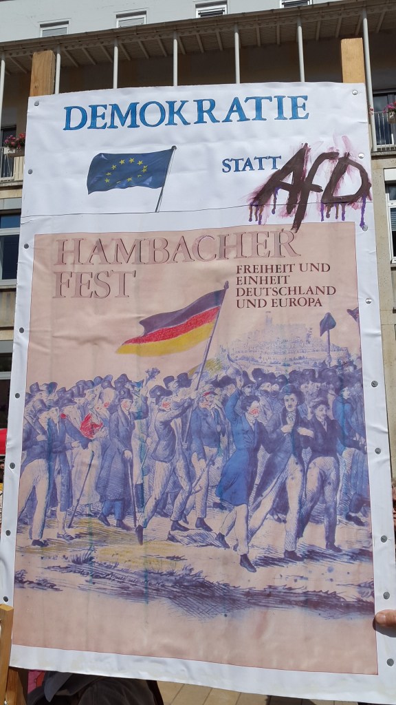 Die Bühne war links mit einer großflächigen Fahne dekoriert, schwarz-rot-gold, mit der Inschrift „Deutschlands Wiedergeburt“. Das stand auch auf den Fahnen des Hambacher Festes von 1832, auf das sich Max Otte mit nicht ganz lauteren Absichten beruft. War es eine nachlässige, nicht fachmännische Befestigung oder gar Sabotage? Jedenfalls hing die riesige Fahne nach der Pause nur noch schlaff an einem Zipfel auf die Bühne herab. Ein erstes Menetekel?