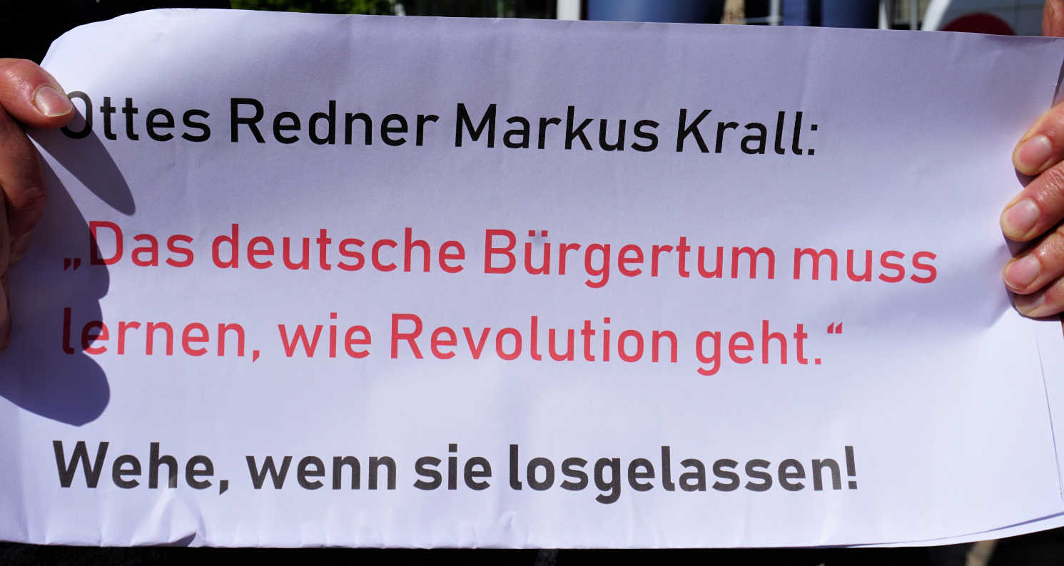Was Krall zu einem wirklich gefährlichen Rechtsextremisten macht, ist sein Spiel mit dem revolutionären Aufstand, zu dem zur Rettung von Vaterland und guten Sitten das Bürgertum aufgerufen sei. In diesem Jahr verpackte er es, ich hatte fast darauf gewartet, in den Verweis auf das Widerstandsrecht in Artikel 20 (4) des Grundgesetzes: