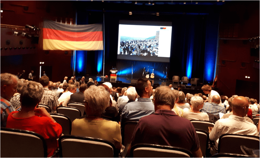 Die Bühne war links mit einer großflächigen Fahne dekoriert, schwarz-rot-gold, mit der Inschrift „Deutschlands Wiedergeburt“. Ja, das stand auch so auf der Hambacher Fahnen von 1832. War es eine nachlässige, nicht fachmännische Befestigung oder gar Sabotage? Jedenfalls hing die riesige Fahne nach der Pause nur noch schlaff an einem Zipfel auf die Bühne herab.