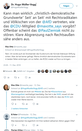 Der schon erwähnte Müller-Vogg twitterte dazu: „Kann man wirklich christlich-demokratische Grundwerte Seit‘ an Seit‘ mit Rechtsradikalen und Völkischen von der @AfD vertreten, wie das @CDU-Mitglied @maxotte_says vorgibt?“ (11.8.2018)