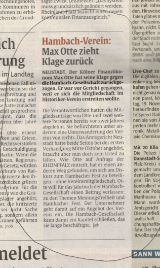 Als die Rheinpfalz am 12.11. über Ottes Rücknahme der Klage berichtete und auf eine „Einigung“ mit der Hambach-Gesellschaft verwies, löste dies bei vielen Freunden des Hambacher Festes und Aktivisten gegen den Missbrauch des Hambacher Schlosses völliges Unverständnis, entsetztes Kopfschütteln bis hin zu einer scharfen Missbilligung aus.