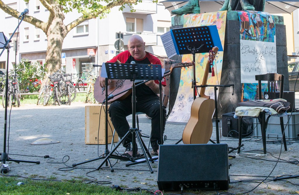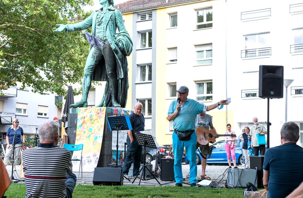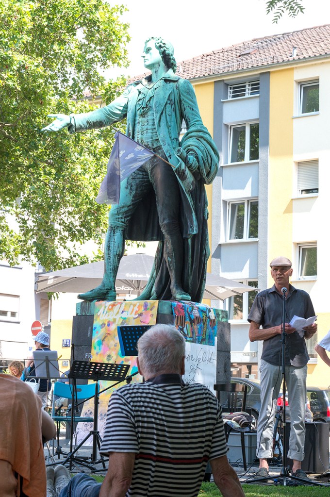 Am letzten Sonntag, 25.7., fand das 5. Kulturfest am Schillerdenkmal auf dem Mannheim Schillerplatz (B 3) statt. Das momentan etwas launische Wetter, war sommerlich, frisch und angenehm wie das von der Initiative „Bunte Vielfalt statt völkischer Einfalt“ (Bettina Franke, Einhart Klucke, Bernd Köhler, Monika-Margret Steger) vorbereitete Kulturprogramm. Ca. 150 Leute waren der Einladung gefolgt und versammelten sich im Schatten des riesigen, japanischen Schnurbaums (Sophora).