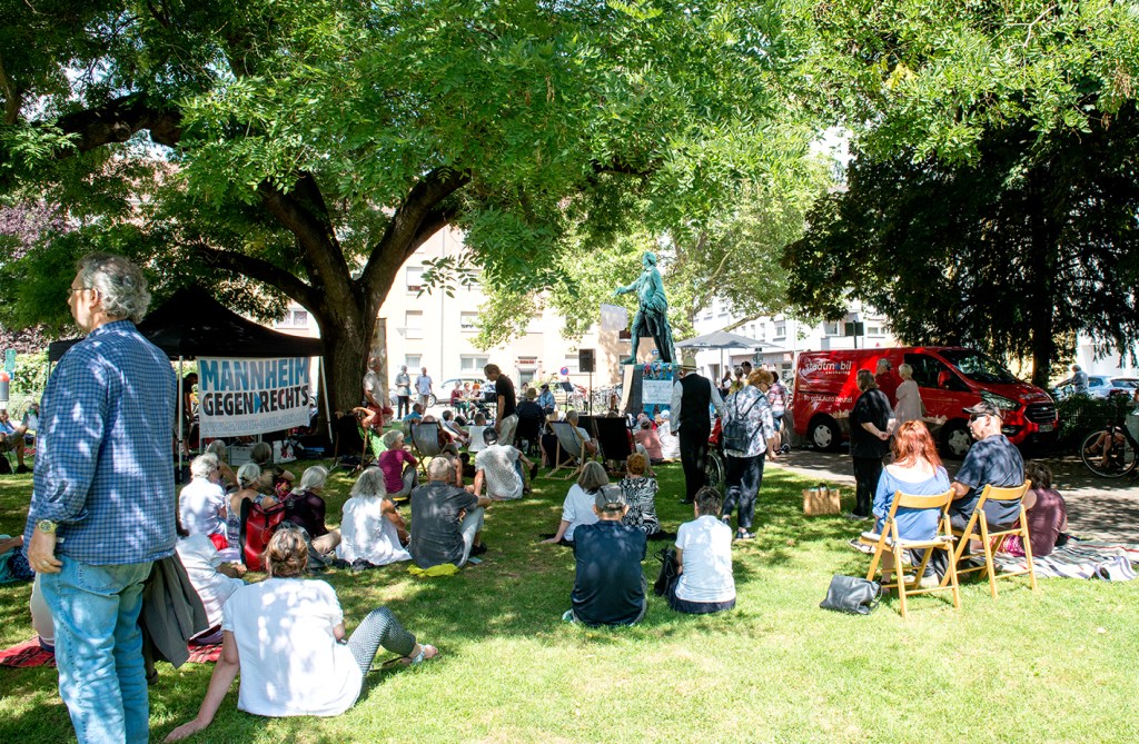 In diesem Jahr hat sich eine Initiative zur Durchführung der Demokratietagen #2021HAMBACH1832 gebildet, um in der gesamten Rhein-Neckar Region mit einer bunten Palette von Veranstaltungen gegen den Missbrauch des Hambacher Schlosses und die dortigen rechtsextremistischen Auftritte anzutreten. Über 20 Veranstaltungen haben seit Ende Mai in Heidelberg, Mannheim, Speyer, Neustadt, Landau und Bad Bergzabern stattgefunden. Viele, viele Kooperationspartner haben die Veranstaltungen unterstützt, wofür ich an dieser Stelle ein ganz herzliches Dankeschön sage. Das Schillerplatzfest ist heute der krönende Abschluss dieser Demokratietage.