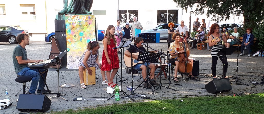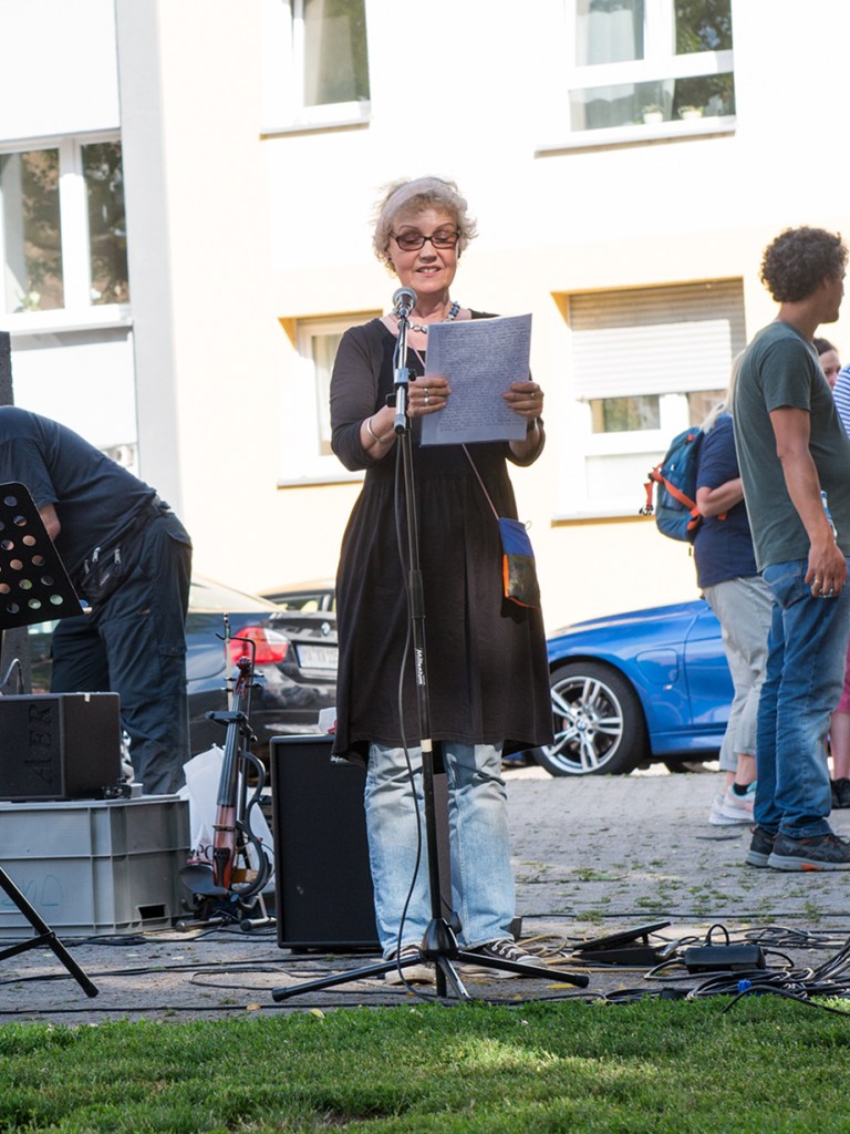 In ihrer Lesung erinnerte die Schauspielerin Bettina Franke an die kürzlich verstorbene politische Aktivistin, Musikerin und Holocaust Überlebende Esther Bejarano. Zum Abschluss steuerte Bernd Köhler und Joachim Romeis den Partisanen-Klassiker „Bella Ciao“ und eine auch schon klassisch anmutende Eigenkomposition von Bernd Köhler bei: „Blauer Planet“. Einhart Klucke, Mannheimer Schauspieler und Kabarettist, führte mit leichter Hand durch das Programm.