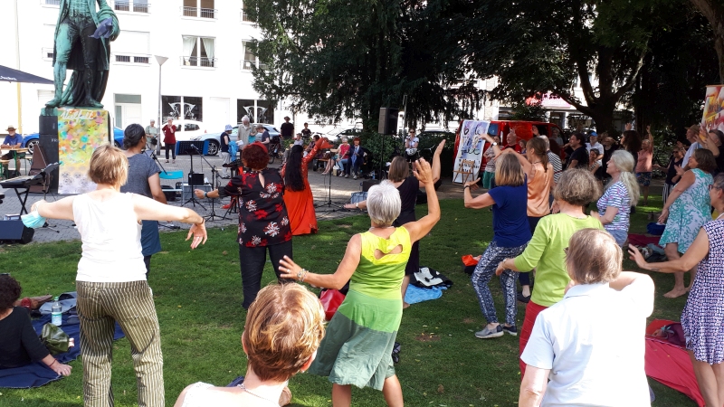 Dem Vielfaltsgebot folgend folgte unter Anleitung von Pranita „Bollywoodtanz zum Mitmachen“. Das mittanzende Publikum war mit viel Freude begeistert dabei. Schließlich spielte die Gruppe Monimates gecoverte und eigene Lieder, fetzig und frech, in bunter Besetzung.