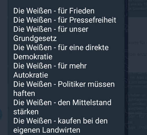Schön auch die Hinweise, was auf Plakate geschrieben werden soll, etwa: „Die Weißen – für mehr Autokratie!“ An ihren Parolen sollt ihr sie erkennen: Autokratie, eine Herrschaftsform, in der eine Einzelperson oder Personengruppe unkontrolliert politische Macht ausübt und keinen verfassungsmäßigen Beschränkungen unterworfen ist. Vielleicht war aber auch Autarkie gemeint …