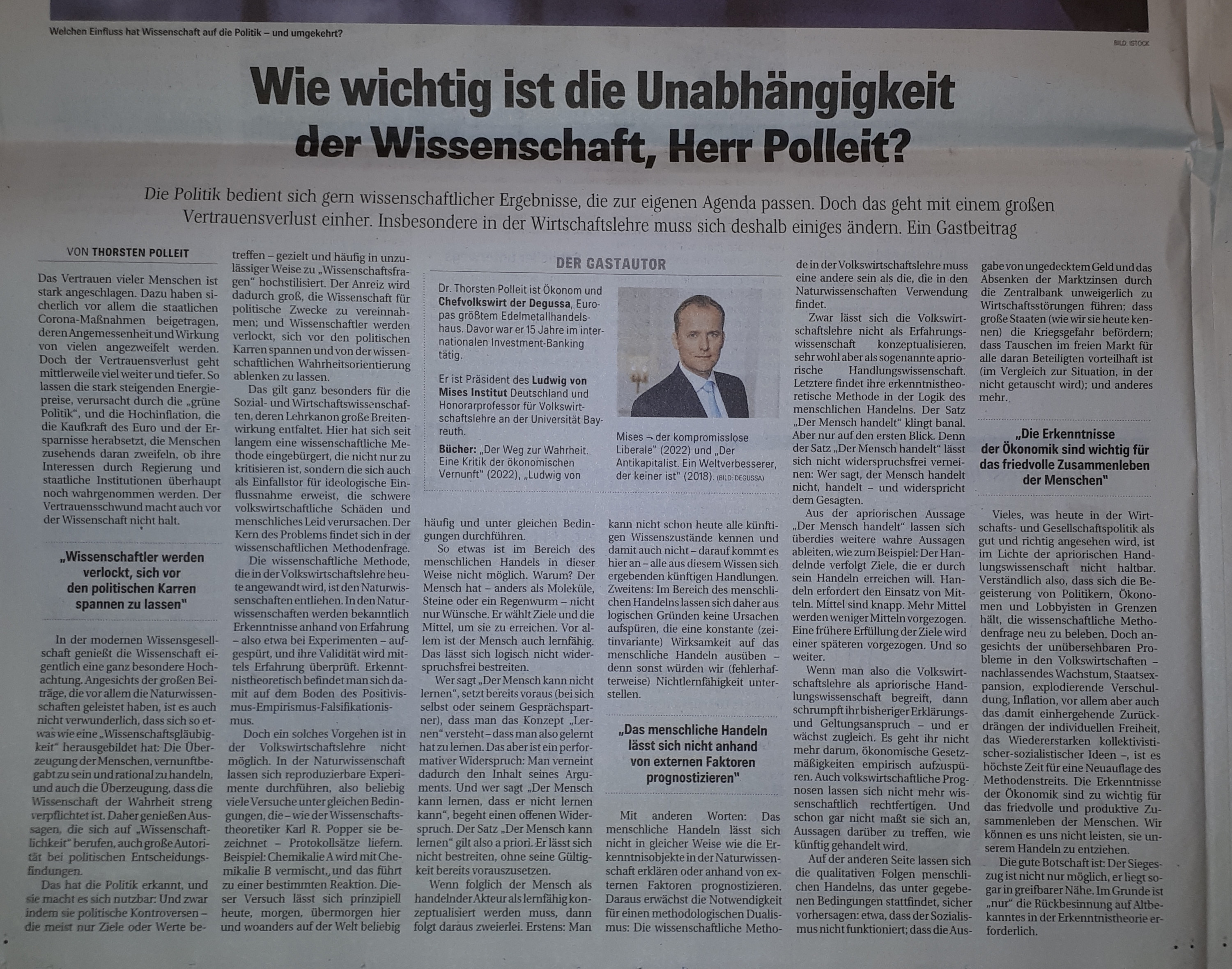 Am 10.9.2022 enthielt diese Rubrik einen Beitrag von Thorsten Polleit unter dem mehr oder weniger unverfänglichen Titel „Wie wichtig ist die Unabhängigkeit der Wissenschaft, Herr Polleit?“ (Beitrag hinter Bezahlschranke).