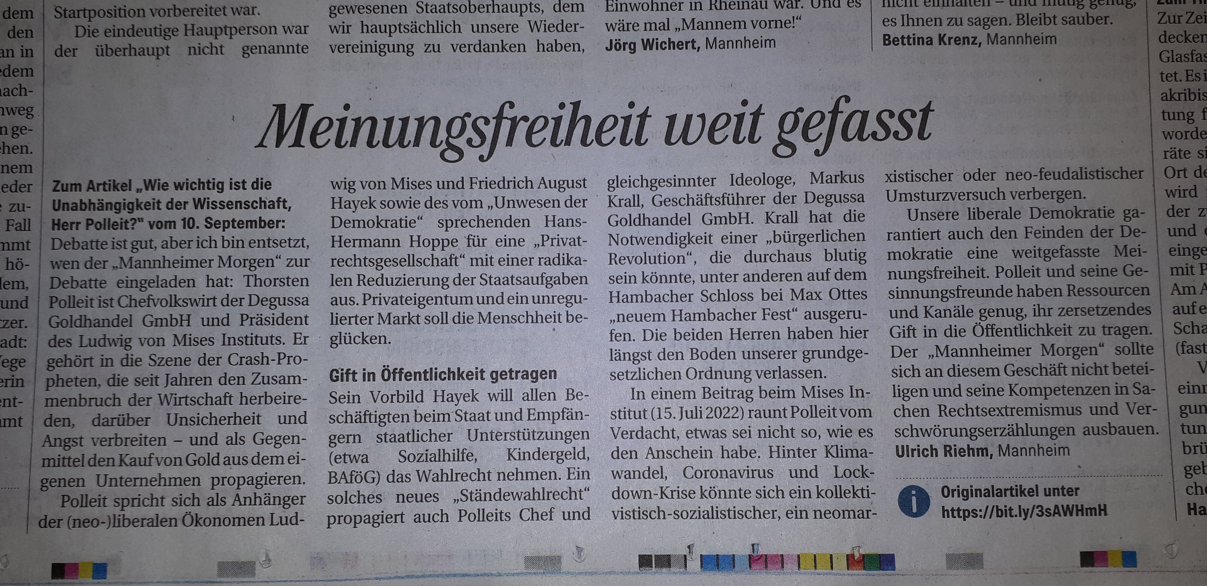 Polleits Debattenbeitrag in der Mannheimer Lokalzeitung provozierte einen Leserbrief, der nach Kürzungsauflagen nach fast zwei Monaten schließlich am 5.11.2022 unter dem etwas unglücklichen Titel „Meinungsfreiheit weit gefasst“ im Mannheimer Morgen veröffentlicht wurde. Passend wäre der Titel gewesen:
