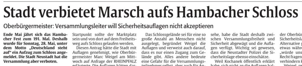 Im Dezember 2022 hatte der Neustadter Unternehmer, Dr. Wolfgang Kochanek, Gründer der „Weißen“-Bewegung und Vertreter einer bundesweiten Initiative „Unternehmen stehen auf“, eine Demonstration vom Neustadter Marktplatz auf das Hambacher Schloss für Pfingstsonntag 28.5.2023 angemeldet. Inhaltlich bleibt eher vage, für was der „Mann aus Neustadt“ mit dieser Demonstration antritt. „Genug ist genug“ ist als Kernparole auf dem Aufruf zu „Hambach 2.0“ zu finden.