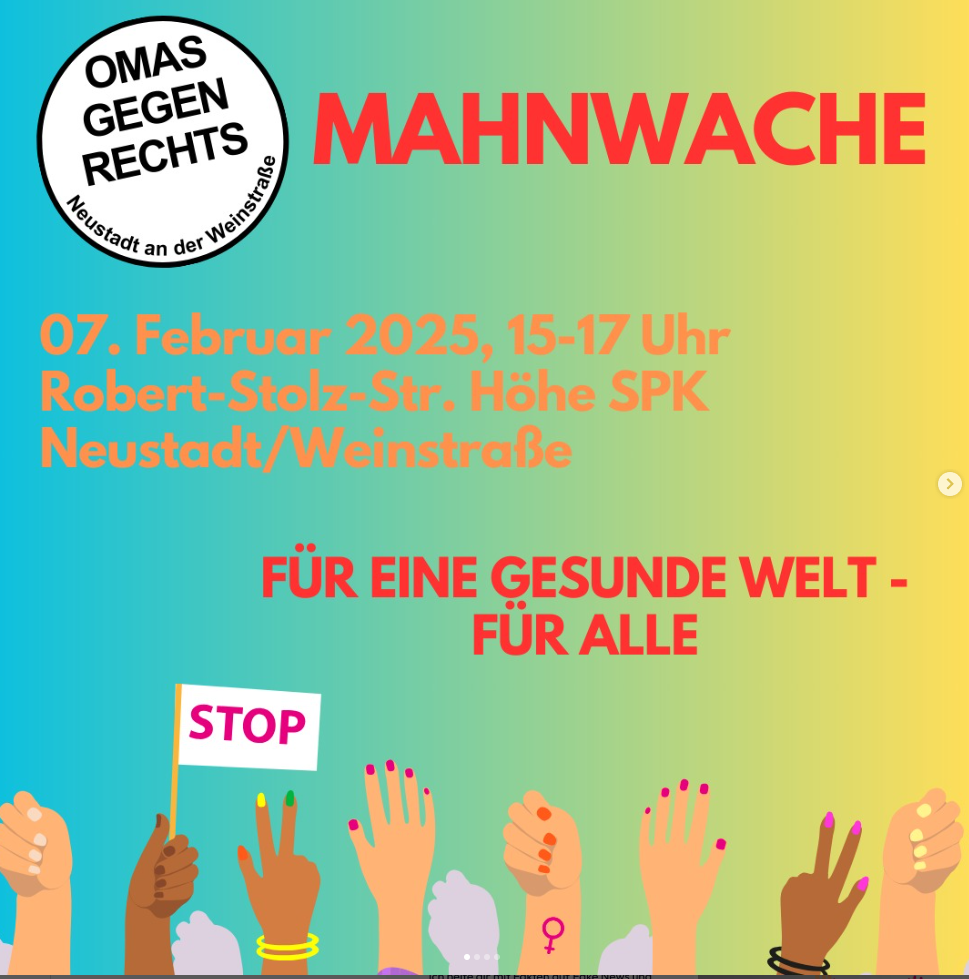 Die Omas gegen Rechts beginnen den Samstag mit ihrer „Mahnwache“ von 10 Uhr bis 12 Uhr am Kartoffelmarkt. Damit hatten sie schon im Januar angefangen und führen diese Mahnwachen bis zur Bundestagswahl fort. Bereits am Freitag, 7.2.2025 stehen die Neustadter Omas (und Opas) an der Robert-Stolz-Str. 34 (neben der Sparkasse) in Neustadt-Böbig. Das Motto ist hier „Eine gesunde Welt – für alle!“