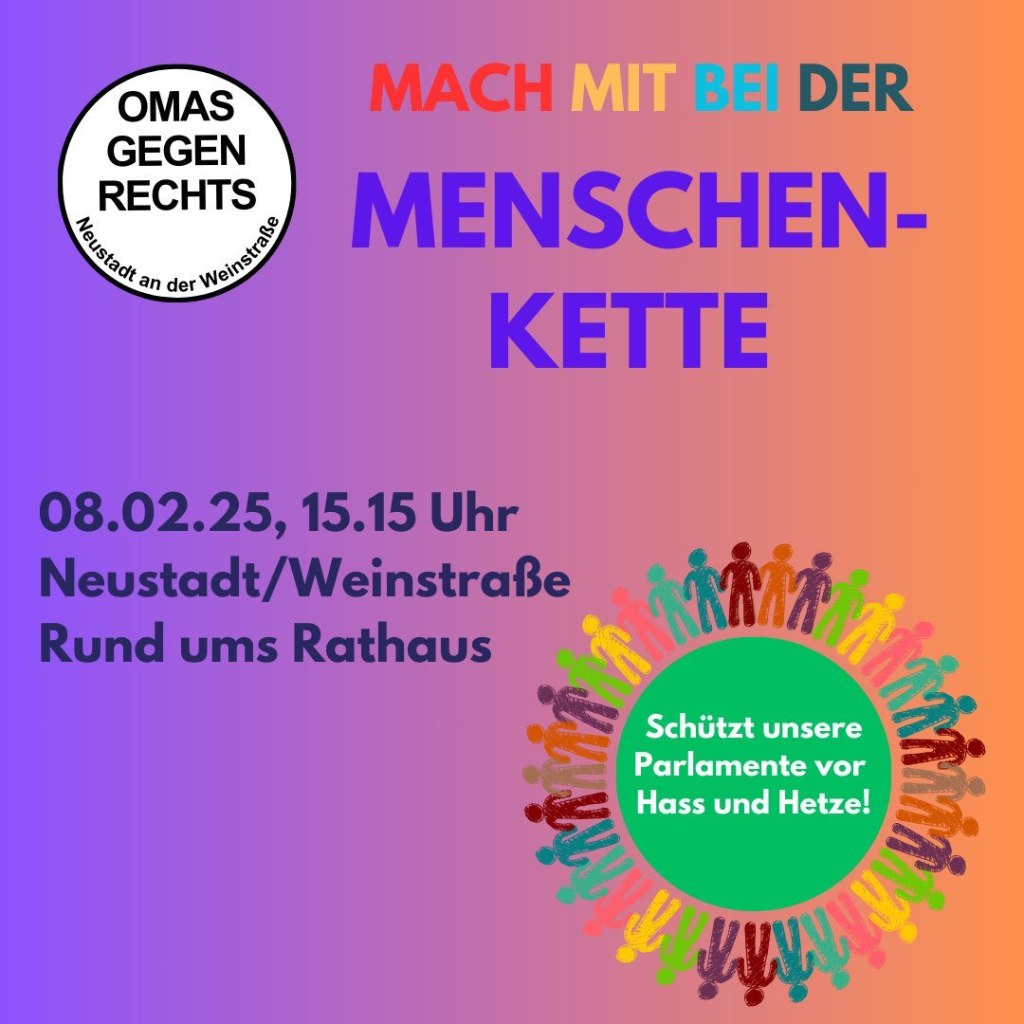 Im Rahmen eines bundesweiten Aktionstages der Omas gegen Rechts mit Menschenketten um die Rathäuser rufen die Neustadter Omas nach der Abschlusskundgebung des Regionalen Bündnisses gegen Rechts zu einer Menschenkette um das Neustadter Rathaus auf. Das könnte so gegen 15:15 sein.