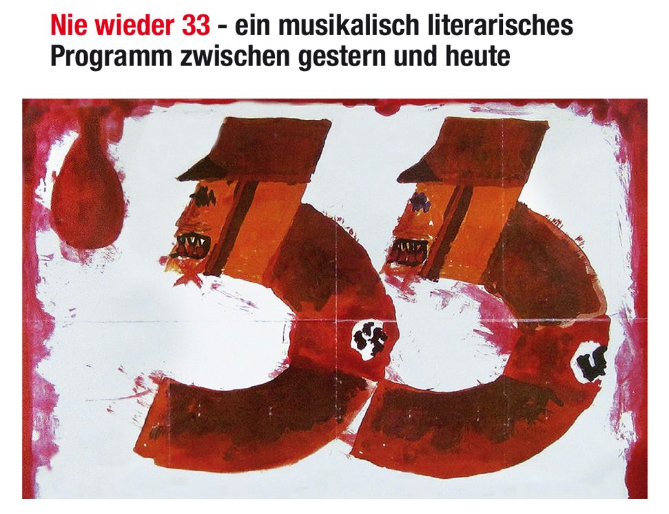 Mit dem Gedicht „An die Nachgeborenen” erinnert Bert Brecht aus dem Exil an das Versagen des Widerstandes gegen den aufkommenden Faschismus, benennt die faschistischen Verbrechen und richtet sein Wort an zukünftige Generationen. Wir nehmen dieses Gedicht als Leitfaden für unser Programm mit Liedern und Texten von Bert Brecht, Hanns Eisler, Klaus Mann, Rose Ausländer, Konstantin Wecker, Theodor Kramer, Esther Bejarano u.a. sowie aktuellen eigenen Songs. Bernd Köhler (Gesang, Gitarre), Bettina Franke (Rezitation, Texte), Joachim Romeis (Geige). Informationen zu den DarstellerInnen und Pressestimmen hier.