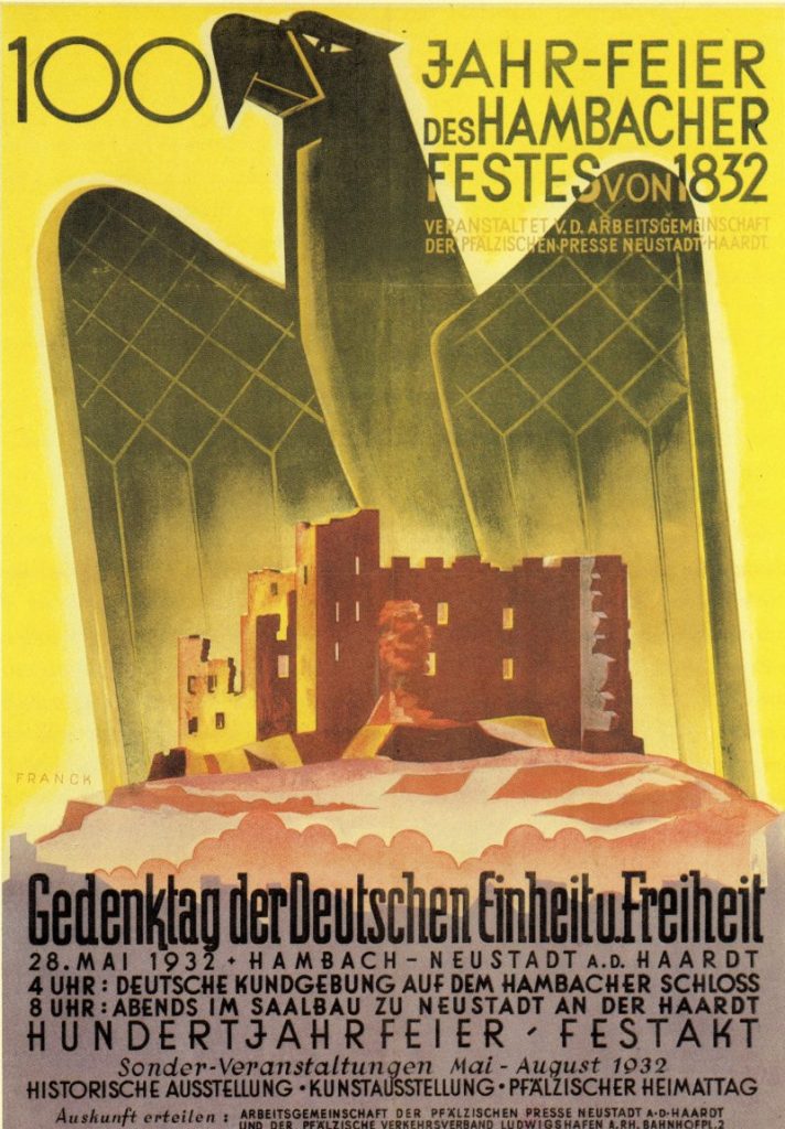 *Ein Teil der Ausführungen stammt – ohne Zitatnachweis – zum einen aus meinen Veröffentlichungen: Das Hambacher Fest im Fokus von Rechtspopulisten und Antidemokraten. In: Jahrbuch der Hambach-Gesellschaft 29 (2022), S. 165-180; Das Hambacher Fest. Ein spät ‚entdeckter‘ Erinnerungsort der deutschen Demokratiegeschichte. In: Ulrich Nieß, Christian Groh und Andreas Mix (Hg.): Stadt und Erinnerungskultur. Tagungsband der 58. Jahrestagung des Südwestdeutschen Arbeitskreises für Stadtgeschichtsforschung (= Stadt in der Geschichte, Band 45), Göttingen 2023, S. 41-68. Zum anderen wurden – ebenfalls ohne Zitatnachweis oder Übernahmebeleg – Passagen aus den folgenden Publikationen übernommen: Bernhard Dietz: Kampf um den Erinnerungsort. Die Neue Rechte und das Hambacher Fest (Teil 1). In: Jahrbuch der Hambach-Gesellschaft 30 (2023), S. 155–171 sowie Kristian Buchna: Das Hambacher Schloss – ein umkämpfter Ort der Demokratiegeschichte, Rede vom 5.4.2025 (vgl. http://www.neustadt.eu/?object=tx.2636.68006.1).